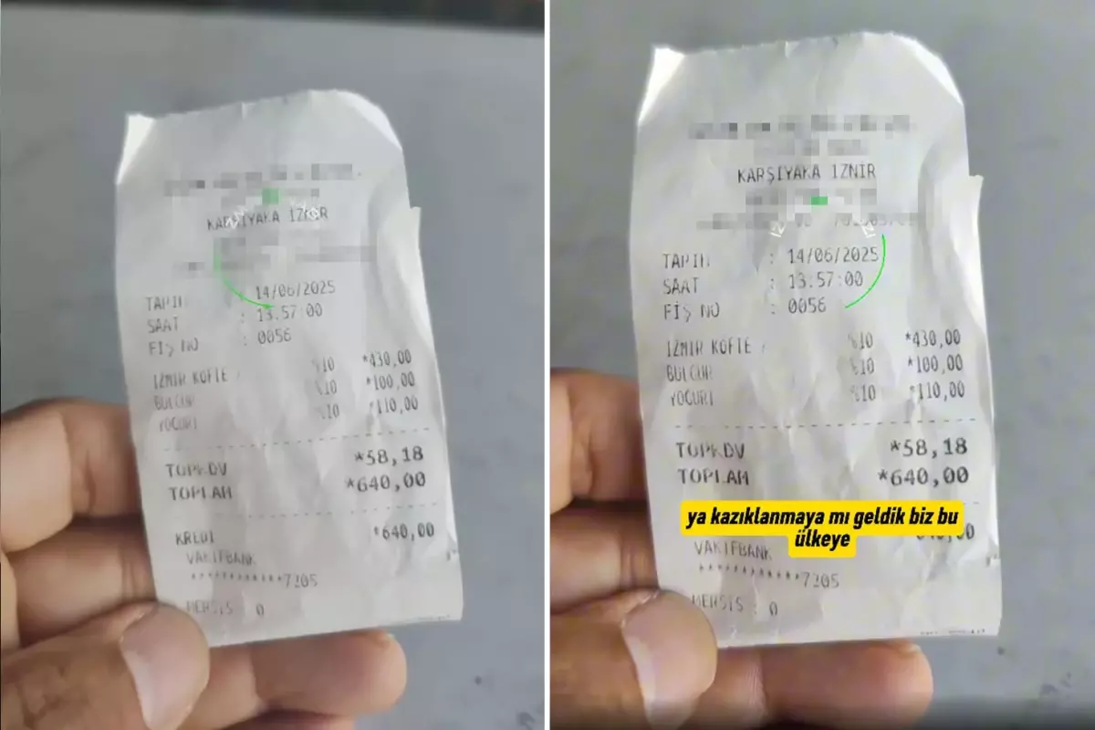 Almanya‘dan İzmir‘e gelen bir gurbetçi, bir restoranda yediği yemeğin akabinde gelen fiş karşısında büyük şaşkınlık yaşadı. Vatandaş, 640 TL’lik hesapta İzmir köftenin 430 TL, bulgur pilavının 100 TL ve yoğurdun 110 TL olmasına reaksiyon gösterdi.