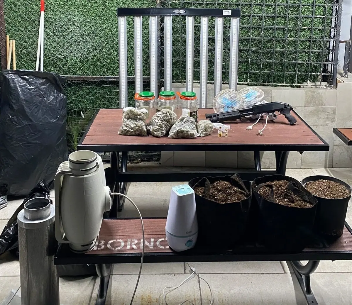 Evde kurulan serada saksı içinde kenevir yetiştirildiği belirlendi. Aramalarda 310 gram esrar, 27 gram kenevir tohumu ve 1 pompalı tüfek ele geçirildi.